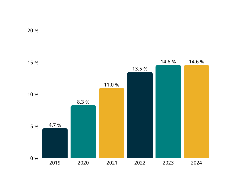 Entre 2019 et 2024, le nombre de demandes d’admission aux études à temps partiel a considérablement augmenté. En 2024, 15 % des demandes d’admission au collège soumises par l’intermédiaire de l’OCAS concernaient des études à temps partiel, contre 5 % en 2019 (voir le graphique ci-dessous).