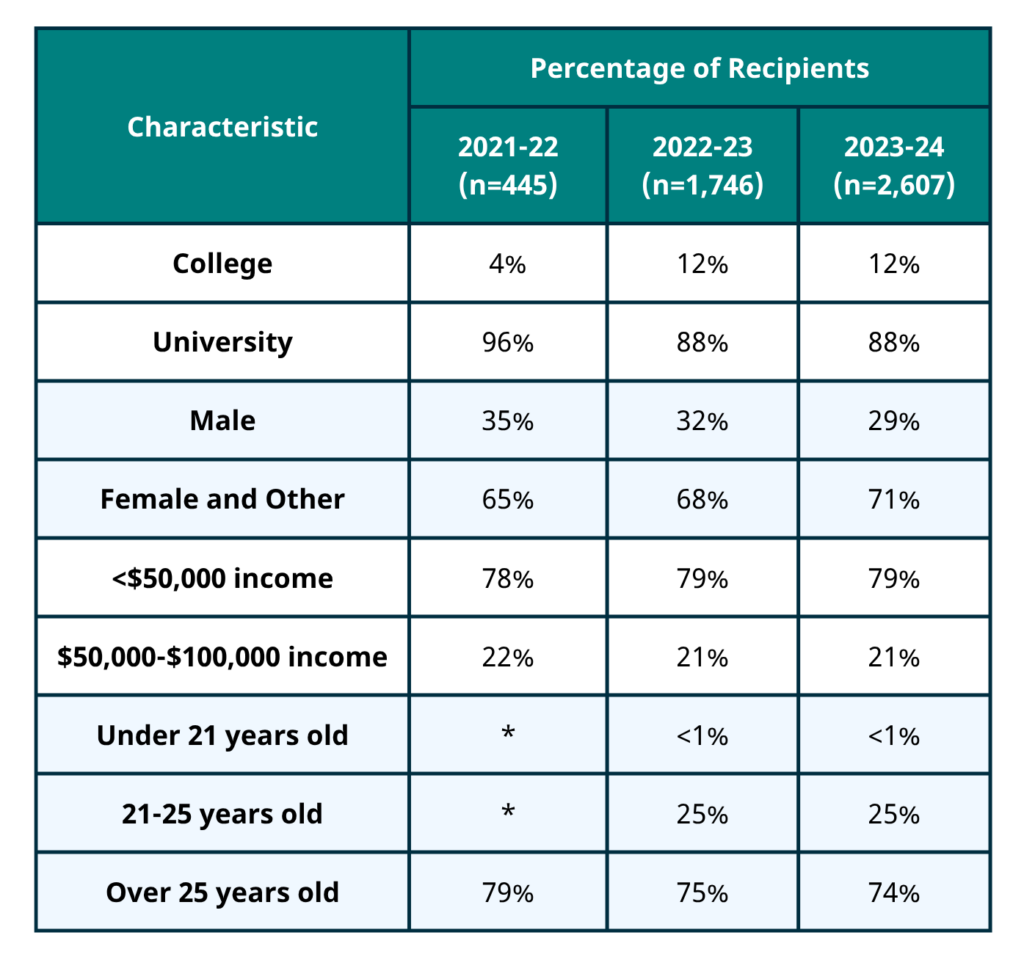 Available data include the number of recipients who received OSAP for microcredentials from 2021-22 to 2023-24, with breakdowns by institution type, gender, age and income. The number of recipients is based on application data, so recipients are counted once for every application where funding was issued. This means that recipients may be included in the sample more than once if they received funding for more than one application.